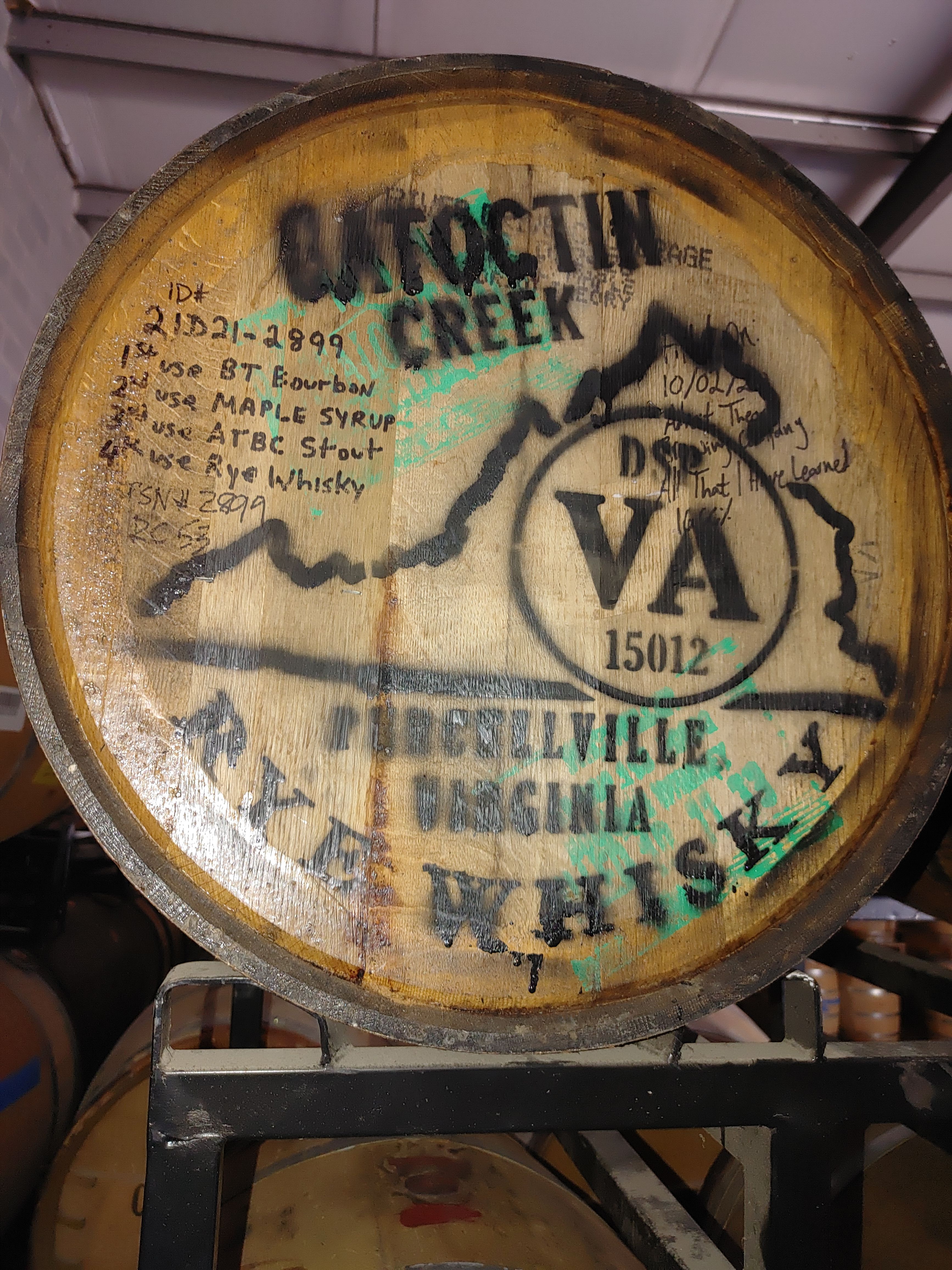 - 1) #2899 - Roundstone Rye finished in a Buffalo Trace Bourbon (Weller) barrel that was used for maple syrup and then stored an Adroit Theory stout. One year in new oak, one year and 10 months in the finish barrel (around 57% abv)